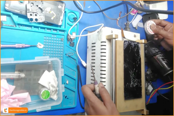 - Dán keo dán kính mới và ép kính vào màn hình LCD bằng máy chuyên dụng.