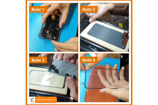Kỹ thuật viên sẽ tháo rời mặt kính cũ của điện thoại, làm sạch các vết dính, bụi bẩn và keo dán. Sau đó, kỹ thuật viên sẽ lắp đặt mặt kính mới cho điện thoại, sử dụng máy ép kính chuyên dụng để đảm bảo độ chính xác, độ bền và độ đẹp cho mặt kính mới.