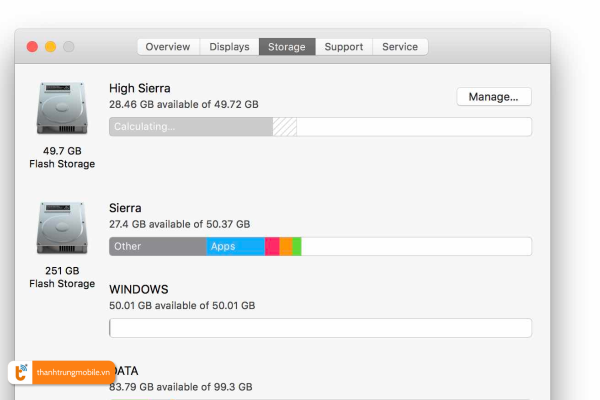 Nếu dung lượng trống dưới 20% tổng dung lượng ổ cứng, đã đến lúc bạn nên cân nhắc việc nâng cấp tại trung tâm sửa chữa Macbook uy tín như Thành Trung Mobile để cải thiện khả năng lưu trữ thiết bị.