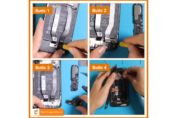 - Tháo máy cẩn thận, thay cụm sạc mới, lắp ráp và kiểm tra kỹ lưỡng.