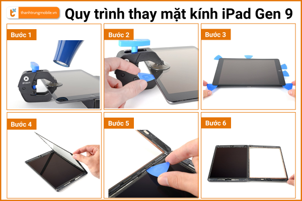 Quy trình thay mặt kính iPad Gen 9 chuẩn xác, đảm bảo chất lượng sẽ bao gồm các bước sau: