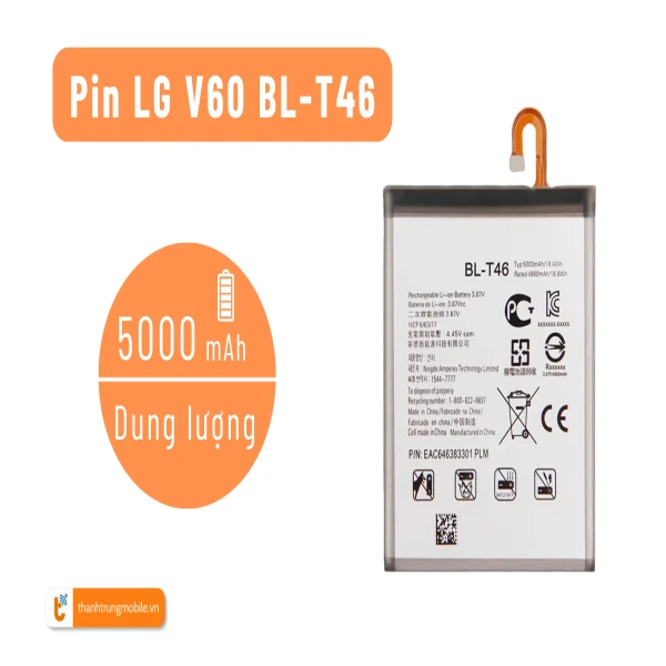 - Sử dụng pin LG V60 chính hãng, mới 100%: Chúng tôi cam kết chỉ sử dụng pin LG V60 chính hãng, mới 100%, có nguồn gốc xuất xứ rõ ràng.