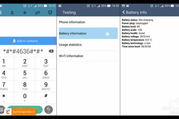 Để kiểm tra tình trạng và tuổi thọ pin Xiaomi Redmi 5 Plus | 5 Pro, ta sử dụng mã lệnh dùng trên bàn phím *#*#4636#*#* và ấn gọi. Trên màn hình xuất hiện thông tin pin.